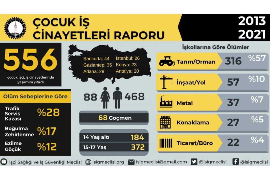 Son dokuz yılda iş cinayetlerinin cinsiyetlerine göre dağılımı şöyle: 88 kız ve 468 oğlan çocuk işçi çalışırken hayatını kaybetti.