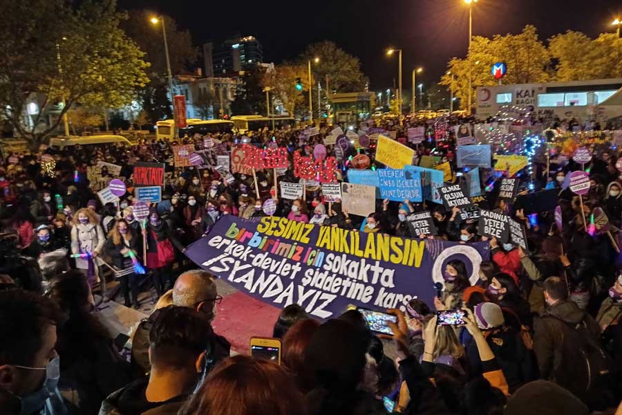 İstanbul’da 25 Kasım Kadına Yönelik Şiddete Karşı Mücadele Günü’nde Taksim Tünel Meydan'ında kafinlar toplanmaya başladı. "Geceleri de sokakları da meydanları da terk etmiyoruz", "Susmuyoruz korkmuyoruz itaat etmiyoruz", "Kadınlar birlikte birlikte güçlü" sloganı atıyorlar. Galatasaray Meydanında açıklama yapmak isteyen kadınların önü Rus Konsolosluğu önünde kesildi. Kadınlar bu tutumun yasaklama olduğunu söyledi. Polis barikatların açılmasını isteyen kadınlara biber gazıyla müdahale etti.