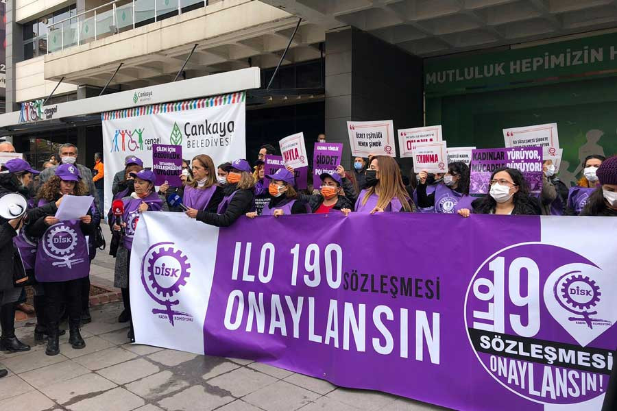 DİSK Kadın Komisyonu, ILO 190 Sayılı Sözleşmenin Türkiye tarafından onaylanması için basın açıklaması yaparak kampanya başlattığını duyurdu.