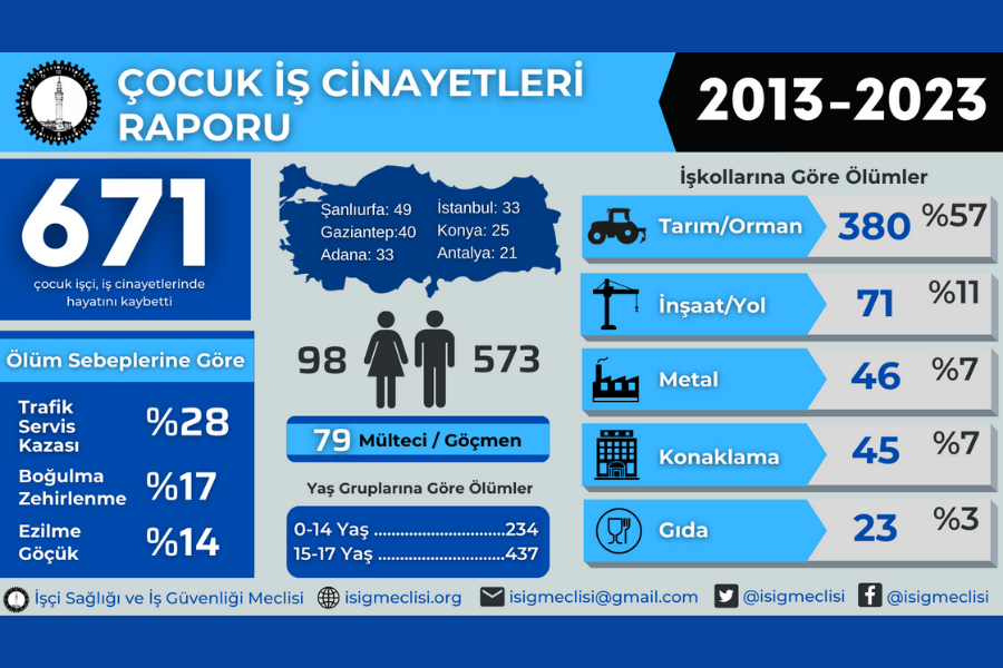 Rapora göre 2013’te 59, 2014’te 54, 2015’te 63, 2016’da 56, 2017’de 60, 2018’de 67, 2019’da 67, 2020’de 67, 2021’de 62, 2022’de 62, 2023’te ise 54 çocuk işçi hayatını kaybetti.