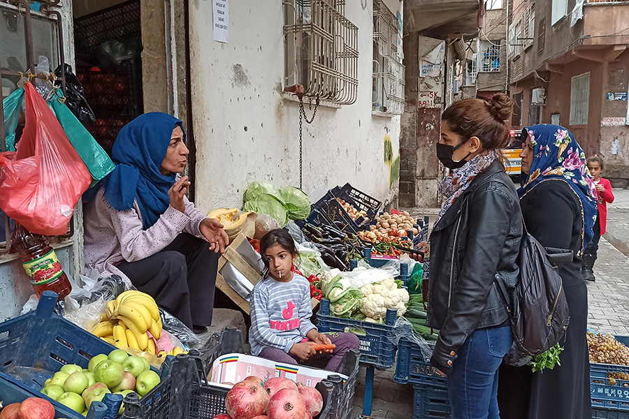 Parkı geçince az ileride kadınların küçük bir manav önünde alışveriş yaptığını görüyoruz. Bu manavı Ayşe işletiyor, genelde kadınların gelip alışveriş yaptığı bu manavda alışveriş yapan Aycan ile sohbet ediyoruz. Kış gelirken hiçbir şey alamadığını, aldıklarını da borçla aldığını ifade ediyor: