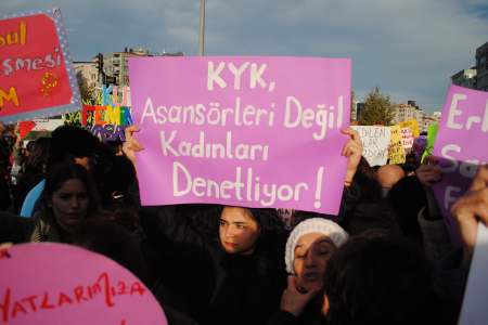 “Ben gece işlerine gidiyorum. Bir tekstil atölyesinde çalışıyordum. Köye gittim, geldim; atölye sahibi başka birini işe almış. Ama köye gitmek zorundaydım, gitmesem olmuyor. Kışlık yiyeceklerimizi getirmek için gittim. Köyden getirmezsek kış boyu aç kalıyoruz. Döndüğümde yalvardım beni işe alsın diye. ‘Abla işler durgun, iş olsa seni alırım. Birkaç hafta sonra seni ararım’ dedi. Bizim binada merdivenleri silen kadın bırakmış, ben de iki haftadır siliyorum. En azından çocuklarımın beslenmesine katkısı olur. Çocukların beslenmesine simit alsam meyve suyu alamıyorum.”