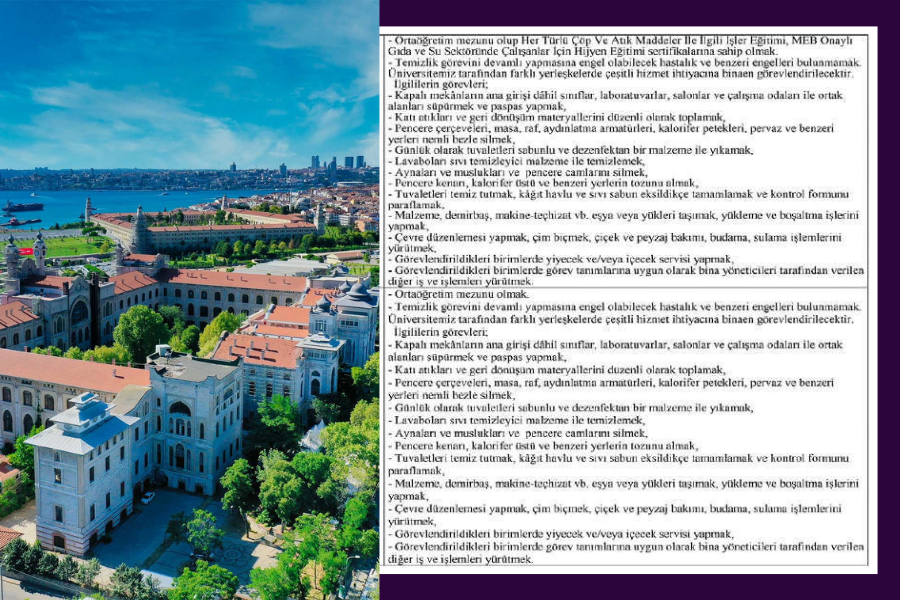 SBÜ Rektörlüğü İstanbul Hamidiye Külliyesi'nde görevlendirilmek üzere alacağı en az ortaokul mezunu 3 kadın destek personeli için verdiği ilanda, görev tanımında temizlikçilik, hamallık, bahçıvanlık, garsonluk gibi birçok meslek çalışanlarının yaptığı işler sıralandı. Çalışacak kadınlardan beklenen işler arasında yok yok!