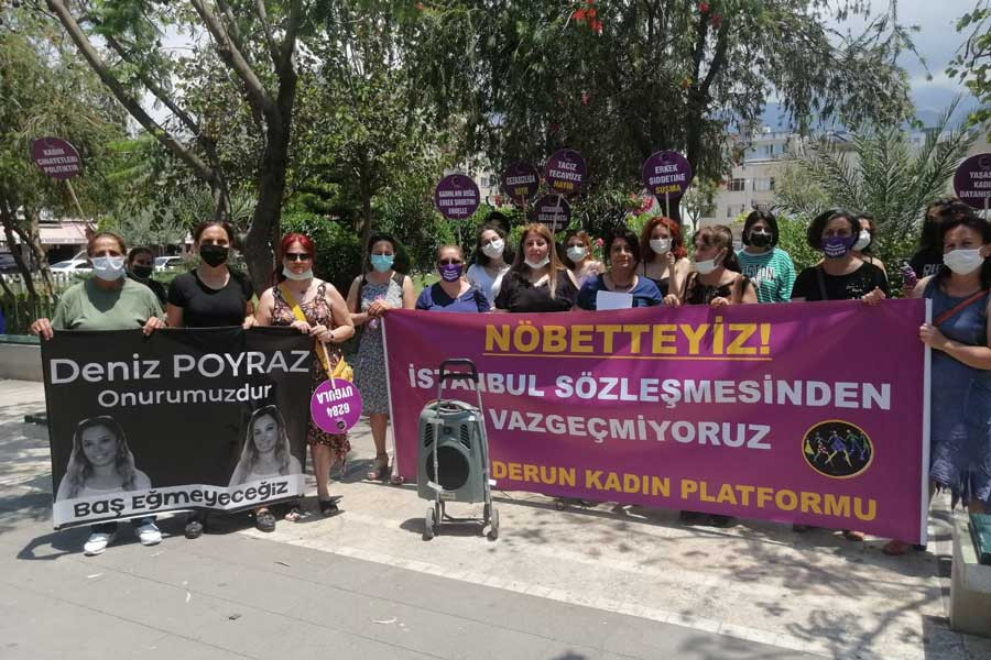 İskenderun Kadın Platformu, İstanbul Sözleşmesi’ne sahip çıkmak için Eski Bit Pazarı’nda bir araya geldi. “Nöbetteyiz! İstanbul Sözleşmesi’nden vazgeçmiyoruz” ve “Deniz Poyraz onurumuzdur. Baş eğmeyeceğiz” pankartını taşıyan kadınlar, Deniz Poyraz’ın katledilmesini de kınadı. İskenderun Kadın Platformu üyesi Feyruz Gör, İstanbul’da düzenlenen “Büyük Kadın Mitingini” selamladı.