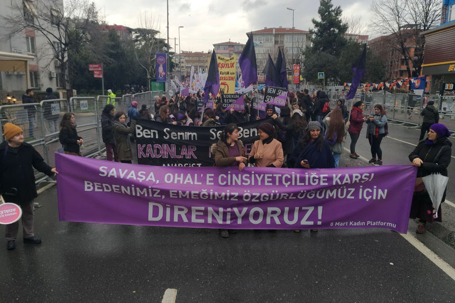 İstanbul 8 Mart Kadınlar Platformu öncülüğünde, “Savaşa, OHAL’e, cinsiyetçiliğe karşı emeğimiz, kimliğimiz ve özgürlüğümüz için direniyoruz” sloganıyla gerçekleşen miting için kadınlar Dikilaş'ta buluştu. Yağmur ve soğuk havaya rağmen buluşan binlerce kadın rengarenk pankartlar ve dövizlerle yürüdü.