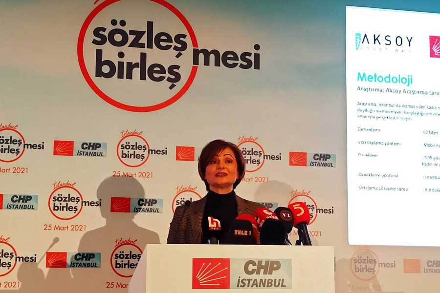 Kaftancıoğlu; gerçekleştirdiği sunumda, yapılan kamuoyu araştırmasının ani bir şekilde çıkartılan Cumhurbaşkanlığı kararı ile feshedilen İstanbul Sözleşmesi’ne yönelik önemli sonuçlar ortaya çıkardığının altını çizerek “3 Martta yaptırdığımız araştırmada ‘İstanbul Sözleşmesi’ni biliyorum’ diyenlerin oranı yüzde 50,5; 'sözleşmeyi duydum ama bilmiyorum’ diyenlerin oranı ise yüzde 23,2. Bilmediğini ifade edenlerin oranı ise yüzde 26,3’tü. 23 Mart tarihli araştırmada aynı soruya verilen yanıtlarda ise anlamlı bir fark bulunuyor. Daha 20 gün önce bilenlerin oranı yüzde 50,5 iken 23 Martta bilinirlik oranı yüzde 75,3’e yükselmiş durumda. Her şerden bir hayır çıkar dedikleri bu olsa gerek. Sonuçlara baktığımızda İstanbul Sözleşmesini ‘kadına şiddeti engelleyen ve kadın haklarını savunan bir sözleşme’ olarak görenlerin oranı yüzde 82,5 iken ‘toplumun genel ahlakına uygun olmayan bir sözleşme’ olarak görenlerin oranı yalnızca yüzde 17,5’tir. Cumhur İttifakına oy veren kadınların yüzde 68,2’si sözleşmeyi olumlu gören ifadeyi desteklemektedir” diye konuştu.