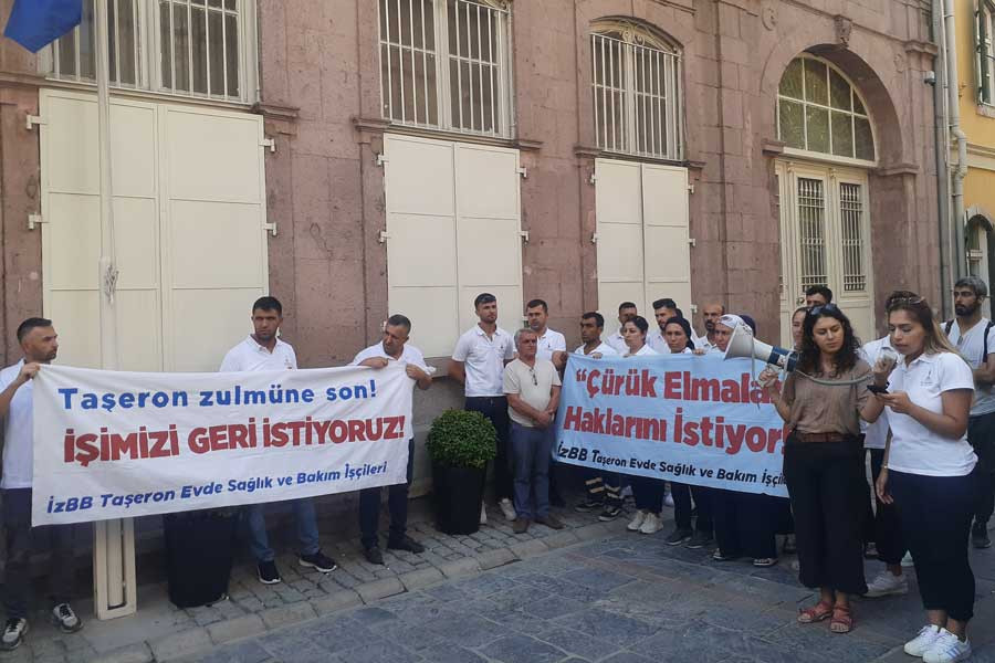 İzmir Büyükşehir Belediyesi evde sağlık ve bakım hizmetinde taşerona bağlı olarak çalışan 30 işçi işten atıldı. İşçiler belediye binası önünde açıklama yaptı, işlerini geri istedi.