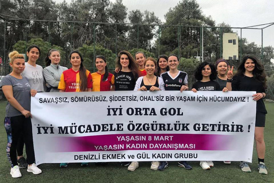 Kadınlar “Savaşsız, sömürüsüz, şiddetsiz, OHAL’siz bir yaşam için hücumdayız” ve “İyi orta gol, iyi mücadele özgürlük getirir” pankartını taşıdılar.