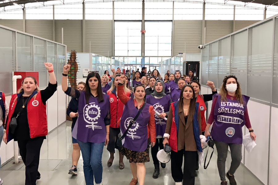 İş yerleri olan Kültürpark’ta yer alan 4 No’lu hol önünde bir araya gelen kadınlar, “Kadın, yaşam, özgürlük”, “Şiddetsiz bir yaşam istiyoruz”, “Kadın cinayetleri politiktir” ve “Kurtuluş yok tek başına ya hep beraber ya hiçbirimiz” sloganları ile hol içerisinde yürüyüş düzenledi.