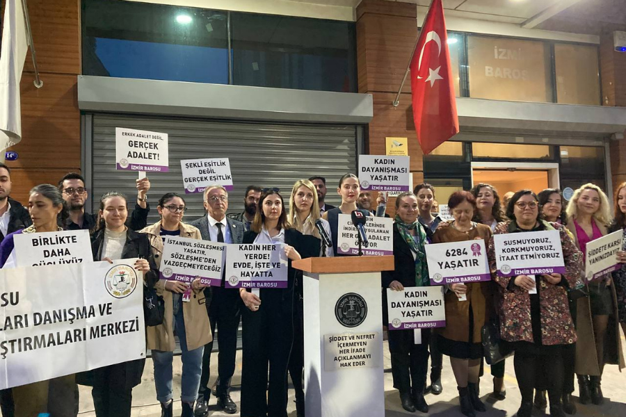 İzmir Barosu, 25 Kasım Kadına Yönelik Şiddetle Dayanışma ve Mücadele Günü kapsamında basın açıklaması düzenledi. Alsancak’ta yer alan İzmir Barosu Merkez Binası önünde gerçekleştirilen açıklamada, “Susmuyoruz, korkmuyoruz, itaat etmiyoruz”, “Boşanmayı değil şiddeti önle”, “Nafaka haktır vazgeçmiyoruz” ve “Erkek adalet değil gerçek adalet” sloganları atılırken, basın metnini İzmir Barosu Kadın Hakları Merkezi Üyesi Av. Elif Musluoğlu okudu.
