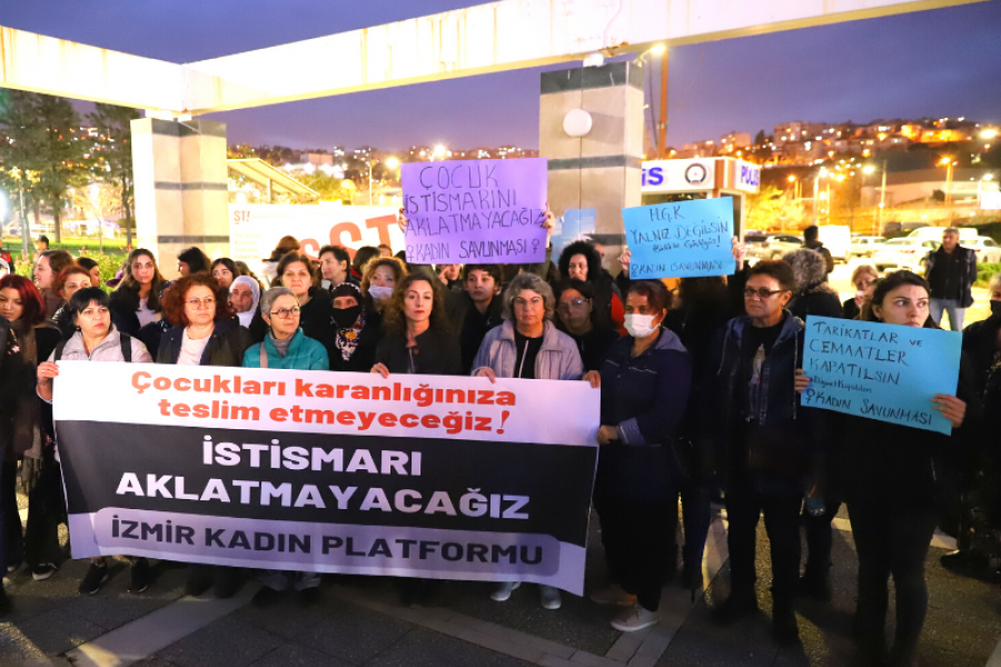 İzmir Kadın Platformu, tarikat ve cemaatlerde yaşanan çocuk istismarlarına karşı basın açıklaması yaptı. Konak İskele önünde bir araya gelen kadınlar, “Çocukları karanlığınıza teslim etmeyeceğiz. İstismarı aklatmayacağız” pankartı açtı. Platform adına açıklamayı Sibel Örkmez okudu.