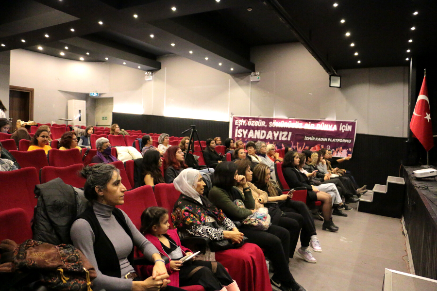 İzmir Kadın Platformu (İKP), 25 Kasım Kadın Yönelik Şiddete Karşı Uluslararası Mücadele Günü Kapsamında etkinlik düzenledi. Kültürpark Gençlik Tiyatrosu’nda gerçekleştirilen etkinlikte konuşmalar, İranlı ve İzmirli kadınların dans performansı, Ekmek ve Gül müzik grubunun dinletisi ve kadınlar taleplerini içeren bir mizansen sergilendi.