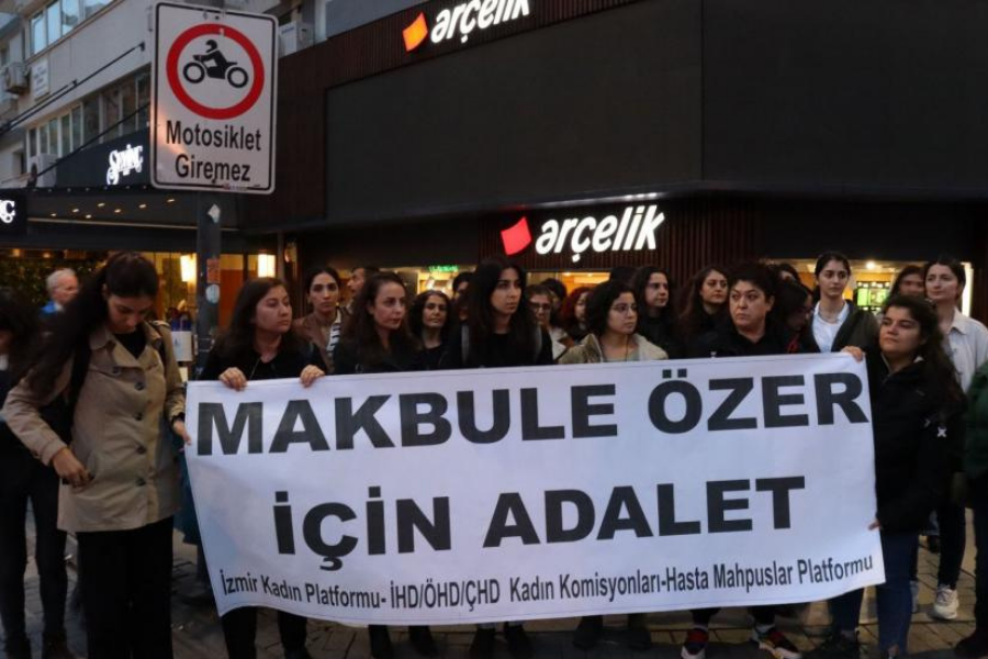 İzmir Kadın Platformu, Adli Tıp Kurumu’nun (ATK) 81 yaşındaki Makbule Özer ile ilgili “cezaevinde kalabilir” raporu üzerinde yeniden tutuklanmasına dönük kararı protesto etti. Sevinç Pastanesi önünde bir araya gelen kadınlar, basın açıklaması yaptı. Açıklamaya İnsan Hakları Derneği (İHD) İzmir Şubesi, Özgürlük İçin Hukukçular Derneği (ÖHD) İzmir Şubesi, Çağdaş Hukukçular Derneği (ÇHD) İzmir Şubesi ve Hasta Mahpuslar Platformu’nun Kadın Komisyonlarının yanı sıra çok sayıda sivil toplum örgütü ve siyasi parti temsilcisi katıldı. “Makbule Özer İçin Adalet” yazılı pankartın taşındığı açıklamayı kadınlar adına Ruken Emektar, yaptı.