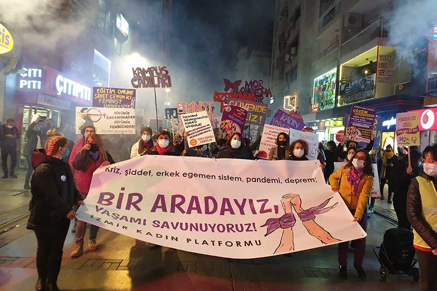 İzmir Kadın Platformu 25 Kasım Kadına Yönelik Şiddete Karşı Uluslararası Mücadele ve Dayanışma Günü dolayısıyla eylem düzenledi. Alsancak Kıbrıs Şehitleri Caddesi Halk Bank önünden bir araya gelen kadınlar Alsancak Türkan Saylan Kültür Merkezi önüne yürüyüş gerçekleştirdi.