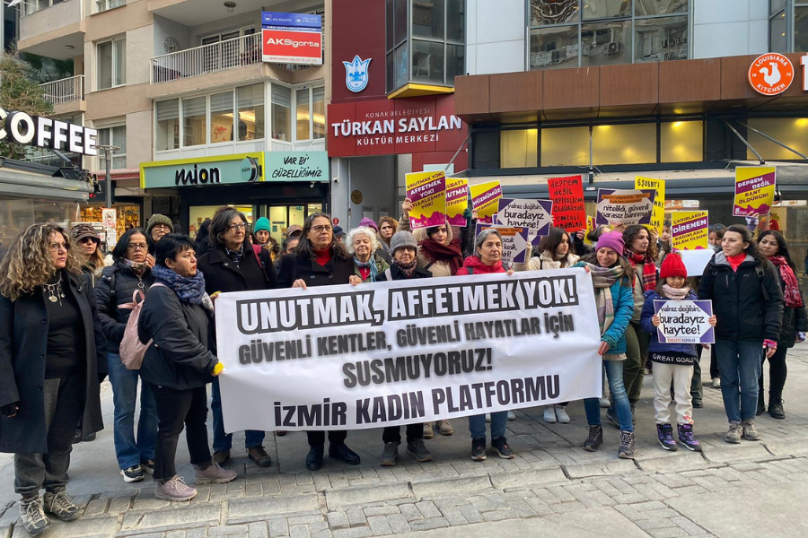 İzmir Kadın Platformu 6 Şubat depreminin ikinci yıldönümünde anma düzenledi. “Unutmak affetmek yok. Güvenli kentler, güvenli yaşam için susmuyoruz” yazılı pankart arkasında bir araya gelen kadınlar Alsancak Türkan Saylan Kültür Merkezi önünden Alsancak Garı’na yürüdü. Sık sık “Unutmak yok, affetmek yok, helalleşmek yok”, “Deprem değil bu bir katliam” sloganlarının atıldığı eylemde İzmir Kadın Platformu adına basın metnini Nuray Öztürk okudu.