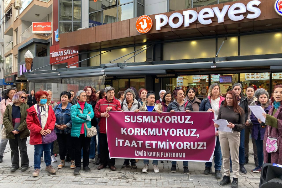 İzmir Kadın Platformu, son bir haftada tutuklanan kadınlara ilişkin Alsancak Türkan Saylan Kültür Merkezi önünde basın açıklaması yaparak, protesto etti. “Susmuyoruz, korkmuyoruz, itaat etmiyoruz” yazılı pankart açan kadınlar, “Yaşasın kadın dayanışmamız”, “Gözaltılar, tutuklamalar, baskılar bizi yıldıramaz”, “Jin jiyan azadi” sloganları attı.