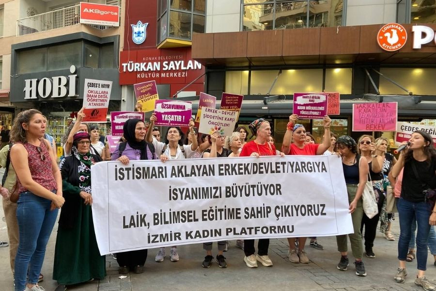 İzmir Kadın Platformu, istismara ve eğitimin gericileşmesine karşı basın açıklaması düzenlendi. Alsancak Türkan Saylan Kültür Merkezi önünde bir araya gelen kadınlar, “erkek adalet değil, gerçek adalet”, “koruma, aklama, yargıla” ve “AKP elini çocuklardan çek” sloganları atarken, basın metnini ise Zeynep Reyşen okudu.