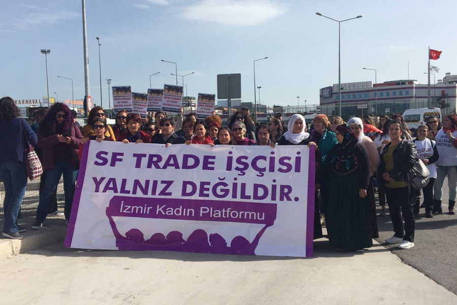 İzmir Kadın Platformu (İKP) 8 Mart Dünya Emekçi Kadınlar Günü dolayısıyla Gaziemir Organize Sanayi Bölgesinde bulunan ve Deriteks Sendikasına üye oldukları için işten atılan ve 140 gündür direnen SF Trade işçilerini ziyaret etti.
