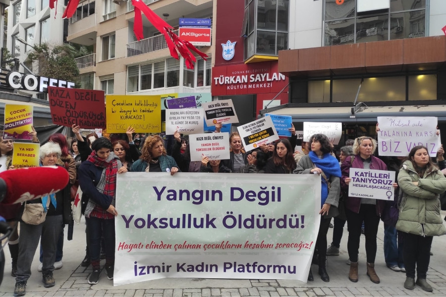 İzmir Kadın Platformu, İzmir'in Selçuk ilçesi anneleri hurda satmaya gittiğinde, elektrikli sobanın devrilmesi nedeniyle evde çıkan yangında 5 kardeşin hayatını kaybettiği olaya ilişkin basın açıklaması yaptı.