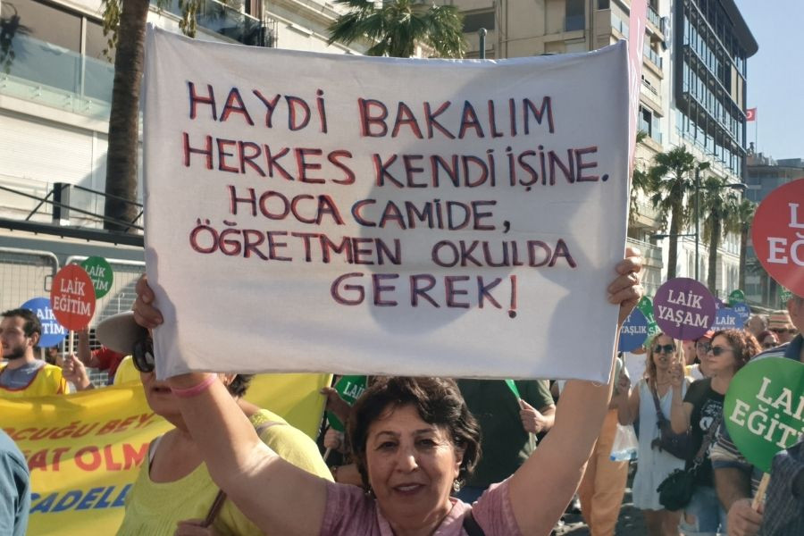 Mitingde Tertip Komitesi adına konuşan Eğitim Sen İzmir 5 No’lu Şube Başkanı Özcan Çetin, laik, kamusal eğitim hakkı için yıllardır mücadele verdiklerini hatırlattı. “Memleketin en yoksul köylerinde okullarının, ilçelerinde kamu yurtlarının kapatıldığı Aladağlarda yoksulluktan, çaresizlikten cemaat, tarikat yurtlarına mecbur bırakılan, çocukların yaşamlarını, umutlarını çalan bu karanlığı, tarikat düzenini reddediyoruz” diyen Çetin, laik ve karma eğitimi hedef alan saldırılara karşı sessiz kalmayacaklarını söyledi.Çetin, “Laiklik kaybedilince ilk kaybeden çocuklardır, gençlerdir, kadınlardır, emekçilerdir. Tam da bu yüzden laiklik mücadelesi emekçi sınıfın mücadelesidir. Eşit, özgür bir Cumhuriyet mücadelesinden de laiklik eşitliktir, laiklik özgürlüktür, laiklik adalettir diyerek okul okul, sokak sokak mücadele etmekten de vazgeçmeyeceğiz” diye konuştu.