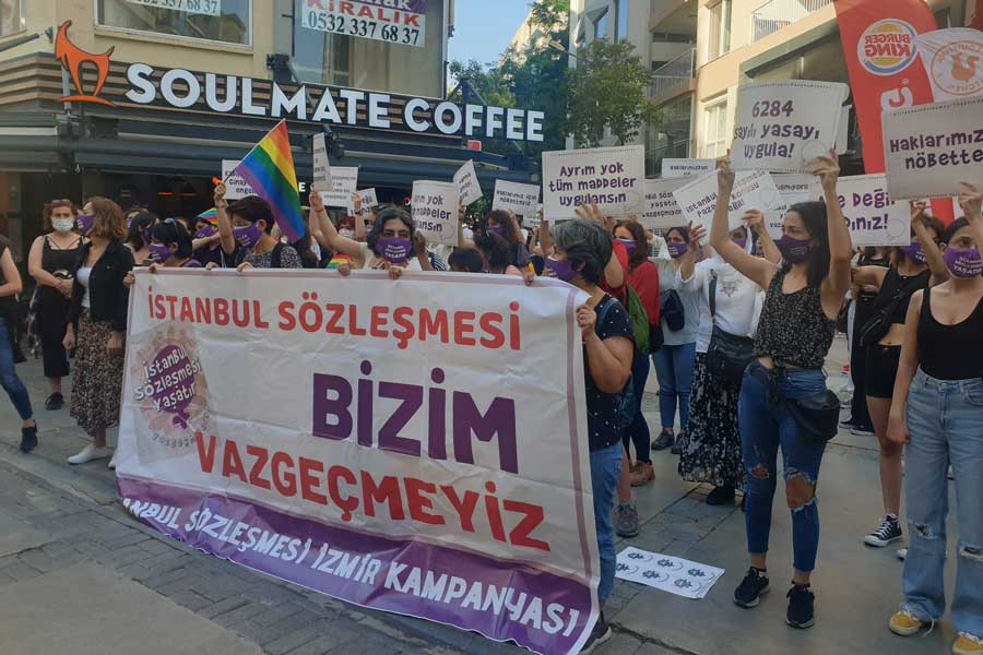 Cumhurbaşkanı kararnamesiyle İstanbul Sözleşmesi’nin 1 Temmuz’da geçerliliğini tamamen kaybedeceğine tepki gösteren İzmirli kadınlar, mücadelesi çağrısında bulundu. https://t.co/Nnz3iuGY1Y pic.twitter.com/RMDj3RoO3K