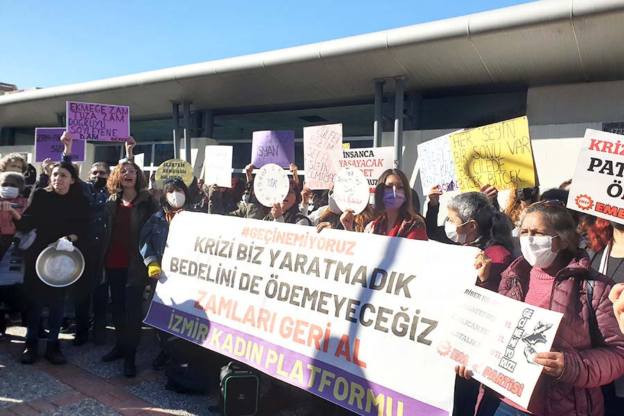 Karşıyaka İZBAN önünde bir araya gelen kadınlar, “AKP elini cebimizden çek", “Krizi yatan bedelini ödesin”, “Krize karşı isyandayız", “Bu zamlarla yaşanmaz, zamlar geri alınsın”, “Diyanete değil kadınlara bütçe” sloganları attı. Basın metnini İzmir Kadın Platformu adına Evrim Çakır okudu.