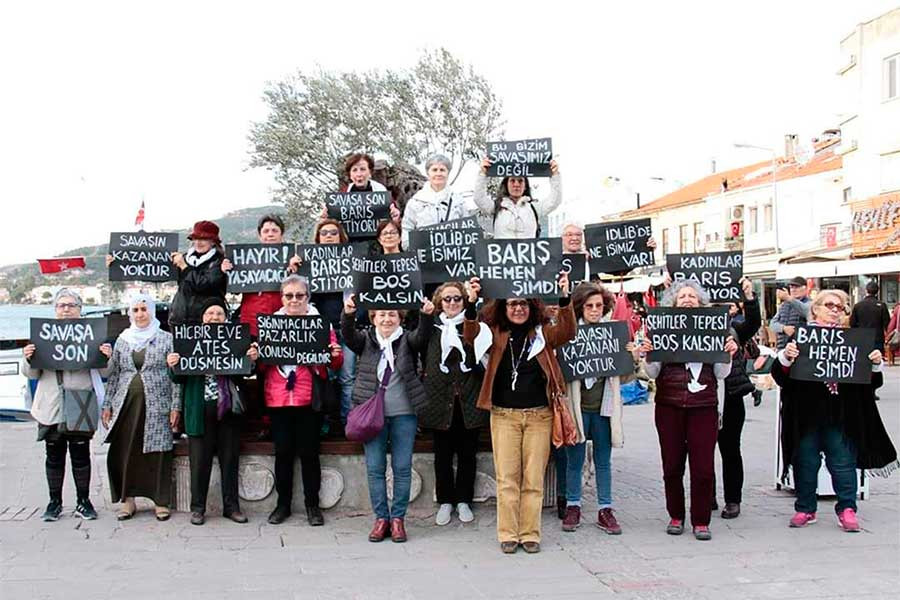 Kadınlar emniyetin yasağına karşı ellerindeki dövizler ile barış talebini Foça sokaklarında dile getirdi. Kadınların taşıdığı dövizlerde ‘Savaşa Son’, ‘Hiç Bir Eve Ateş Düşmesin’, ‘Barış Hemen Şimdi’, ‘İdlip’te Ne İşimiz Var’, ‘Hayır Yaşayacağız’, ‘Bu Savaşın Kazanını Yok’, ‘Bu Savaş Bizim Savaşımız Değil ve ‘Şehitler Tepesi Boş Kalsın’ yazıyordu.