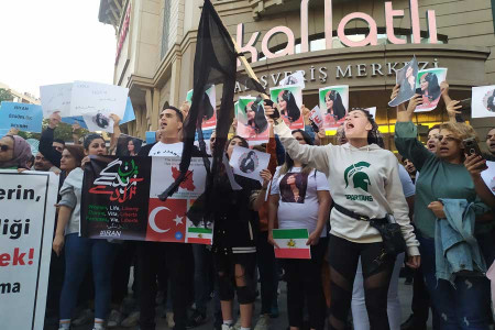 “İran’da, Türkiye’de, her yerde özgürlük” pankartı açılan eylemde sık sık, “Jin jiyan azadi”, “Kadın yaşam özgürlük”, “Zeng zendegi azadi” sloganları atıldı.