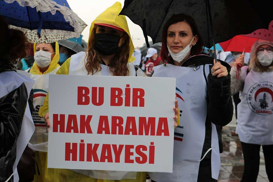 İzmir Sağlık Platformu, sağlık emekçilerin yaşadığı sorunlara dikkat geçmek ve Aile Hekimliği Sözleşme ve Ödeme Yönetmeliğine karşı Alsancak Gündoğdu Meydanı’nda miting gerçekleştirdi. “Susmuyoruz, korkmuyoruz, vazgeçmiyoruz” diyen sağlık emekçileri yoğun yağmura rağmen mitinge katılım gösterdi. Mitingde, “Zafer direnen emekçinin olacak”, “Birleşe birleşe kazanacağız”, “Yağmur fırtına fark etmez emekçiler burada” sloganları atıldı. Mitingde kadınlar da talepleriyle en öndeydi.