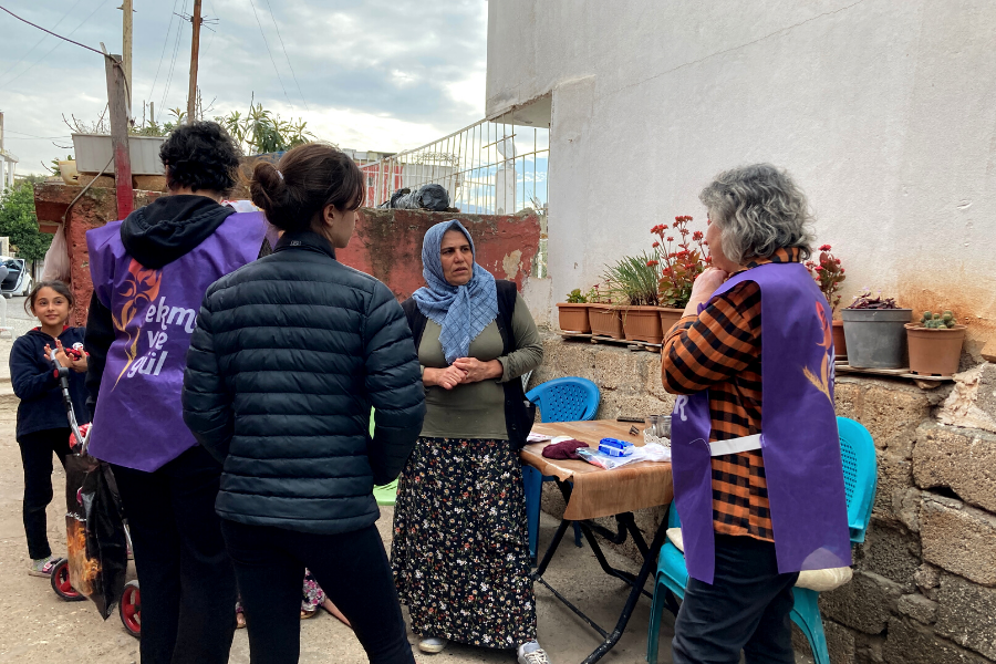 İzmir Ekmek ve Gül Grubu, Bornova Kadın Dayanışma Derneği (BORKAD), Buca Evka-1 Kadın Kültür ve Dayanışma Evi Derneği (BEKEV), Kız Kardeşlik Köprüsü ile Hayatı Yeniden Kuruyoruz kampanyamız kapsamında Hatay’ın İskenderun ilçesine sağlık ve hijyen çadırı kurdu.