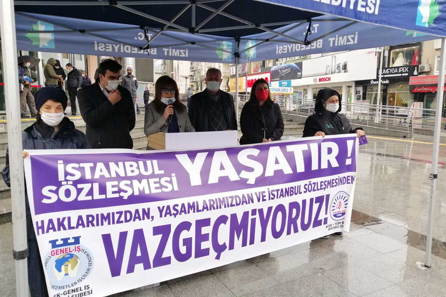 DİSK’e bağlı Genel-İş üyesi işçilerle, KESK’e bağlı Tüm Bel-Sen üyeleri İzmit Belediyesi önünde İstanbul Sözleşmesi eylemi yaptı. İzmit Belediye Başkanı Fatma Kaplan Hürriyet, Emek Partisi Kocaeli İl Başkanı Arzu Erkan, BES Kocaeli Şube Başkanı Yeliz Yılmaz Karstarlı ve CHP üyelerinin destek verdiği eylemde “Tüm Bel-Sen ve Genel-İş Sendikaları olarak erkek-devlet şiddetine karşı yaşam güvencemiz olan İstanbul Sözleşmesi’ne sahip çıkıyor, İstanbul Sözleşmesi’nden vazgeçmiyoruz” denildi.