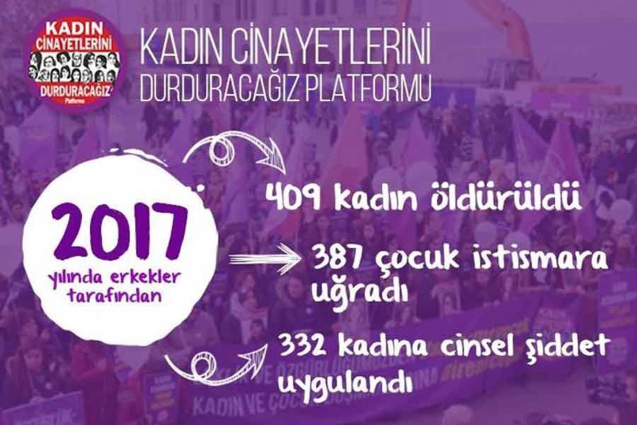 Kadın Cinayetlerini Durduracağız Platformunun (KCDP) açıkladığı verilere göre 2017 yılında kadın cinayetleri yüzde 25 arttı. 409 kadın öldürüldü. Cinayetlerin yüzde 39’u koca, erkek arkadaş, eski koca ya da eski erkek arkadaş tarafından işlendi.