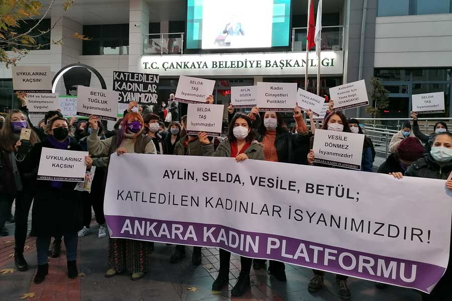 Ankara Kadın Platformu, son kadın cinayetlerine karşı Çankaya Belediyesi önünde toplanarak tepki gösterdi. Kadınların bir kişi daha eksilmemek için mücadele etmeye devam edeceklerini belirten Betül Koca “6284 ve İstanbul Sözleşmesini etkin uygulanmakla yükümlü olduğunuz sorumlulukları yerine getirin” dedi.