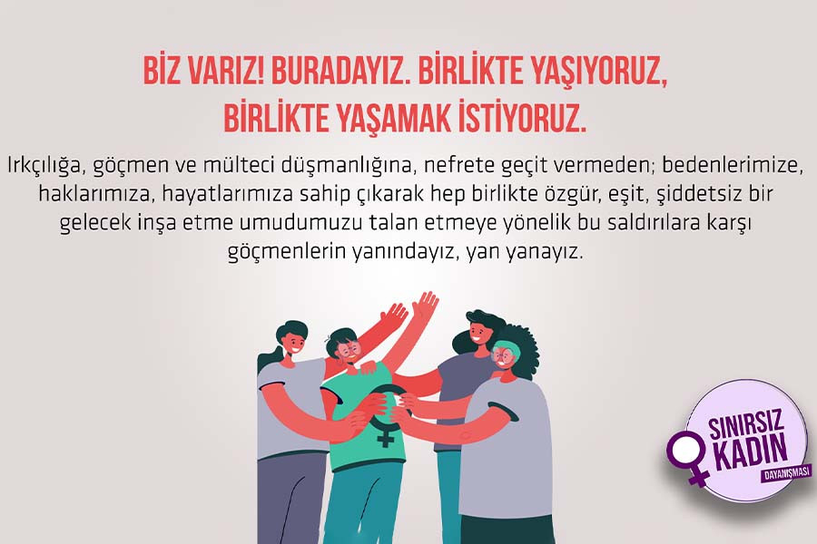 “Kadına yönelik şiddetin milliyeti; kadın dayanışmasının sınırı olmaz!” diyen Sınırsız Kadın Dayanışması hashtag çalışmasında, “Göçmen düşmanlığı, ırkçılığı, kadın ve LGBTİ+ düşmanlığı tescilli siyaset esnafları kadınların güvenliğini öne sürerek ırkçılıklarına meşruiyet zemini yaratmaya çalışıyor. Göçmenlerin ve mültecilerin hedef gösterilmesi ile toplumun her kesiminde ekonomik, toplumsal, siyasal sorunlara karşı biriken öfke yanlış yere kanalize ediliyor, iktidarın sorumluluğunu kamufle ediyor. Göçmenlere yönelik nefret kadınların güvenliği üzerinden yükseltilirken, yaşadığımız güvenlik sorunlarının kaynağı görünmezleştiriliyor. Evleri, sokakları, toplu taşıma araçlarını ve tüm mekânları bizim için güvensiz hale getiren esas sorunlar ve mücadele ettiğimiz koşullar konuşulmuyor. Tüm göçmenleri hedef gösterip, maruz bırakıldığımız sistematik erkek şiddetinin esas nedeni olan erkek egemen sistemi görünmezleştiren bu ikiyüzlülüğe izin vermeyeceğiz!” ifadelerini kullandı.