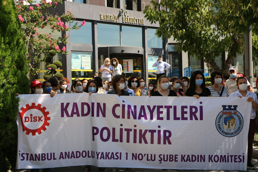 DİSK/Genel-İş İstanbul Anadolu Yakası 1 No’lu Şube Kadın Komitesi’nin çağrısıyla Kadıköy Belediyesi önünde yapılan eyleme, Şube Başkanı Ahmet Arıkan ve şube yöneticilerinin yanı sıra erkek işçiler de katıldı. Eylemde sık sık “Kadına uzanan eller kırılsın”, “Kadın, yaşam, özgürlük”, “Jin, jiyan, azadi” ve “İstanbul sözleşmesi yaşatır” sloganları atıldı. Artan kadın cinayetlerine dikkat çeken Şube Başkanı Ahmet Arıkan, mücadeleyi yükseltme çağrısı yaptı.