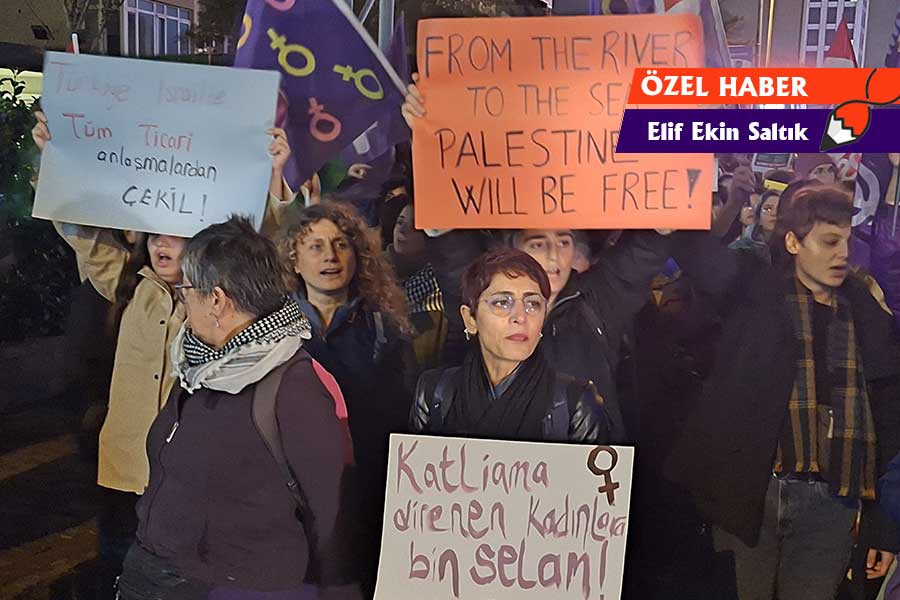 İsrail’in bir yanıyla desteğini aldığı medya araçları ve geniş propaganda ağlarıyla kendisini demokratik, özgürlükçü gösterirken diğer yandan bir halka ekranlarda hakaretler yağdırarak kadın bedeninin teşhiri üzerinden savaş yürüttüğünü belirten Erol şöyle devam etti: “Biz kadınlar yaşamak istiyoruz ama özgür yaşamak istiyoruz. Topraklarımızın işgal edilmediği, açlık ve susuzlukla tehdit edilmediğimiz, dilimizin, kimliğimizin yok sayılmadığı bir toplumda özgür yaşama isteğimiz, bizleri Filistinli kadınların özgürlüğüyle birleştiriyor. Bu mücadele enternasyonal bir mücadele. Kürt halkına yönelik savaşın devam ettiği, Rojava’nın bombalandığı bugünlerde Kürt kadınların özgürlüğü de Filistinli kadınların özgürlüğü de dünyanın her yerinde erkek egemenliğine karşı mücadele eden kadınların özgürlüğü demek. Bu nedenle mücadelemiz, dayanışma eylemlerinin de ötesinde, birbiriyle iç içe geçmiş birleşik kadın özgürlüğü mücadelesi”.