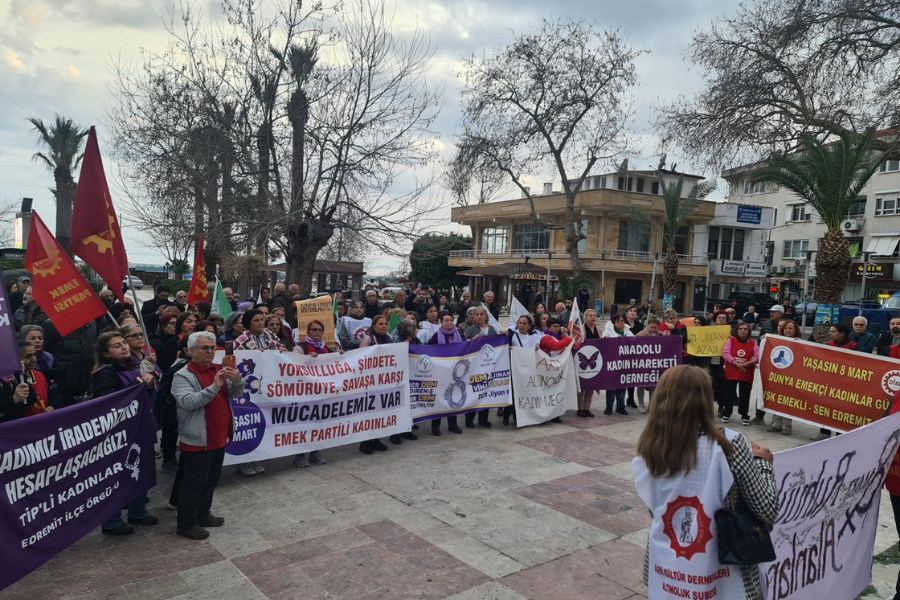 8 Mart kapsamında çeşitli etkinlikler planlayan Edremit Kadın Platformu; Altınoluk Alevi Kültür Derneği'nde şiir, müzik ve film etkinliğinde buluştu. Etkinlik sonrası dernek önünde toplanan kadınlar, sloganlarla yürüyerek Edremit Cumhuriyet meydanında toplandılar. Alevi Kültür Derneği, Emek Partisi, Ekmek ve Gül, DİSK Emekli Sen, Anadolu Kadın Hareketi, Dem Parti, TİP'li Kadınlar pankartları arkasında kadınlar ıslık, zılgıt ve düdük çalarak yürüdüler. Yol boyunca "Susmuyoruz, korkmuyoruz, itaat etmiyoruz", "Kadın yaşam özgürlük", "Jin Jiyan Azadi", "Vardık, varız, var olacağız", "İş, ekmek, özgürlük" sloganları atıldı.