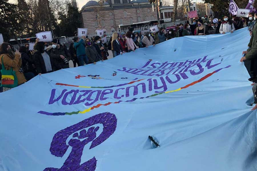 Türkiye'nin İstanbul Sözleşmesi’nden çekilmesi kararına tepki gösteren kadınlar İstanbul Beşiktaş’ta bir araya geldi. Sözleşme’nin kaldırılmasından bu yana erkekler tarafından katledilen 50 kadını temsilen 1’den 50’ye kadar pankart taşıyan kadınlar, “Erkek adalet değil gerçek adalet” diye seslendi.