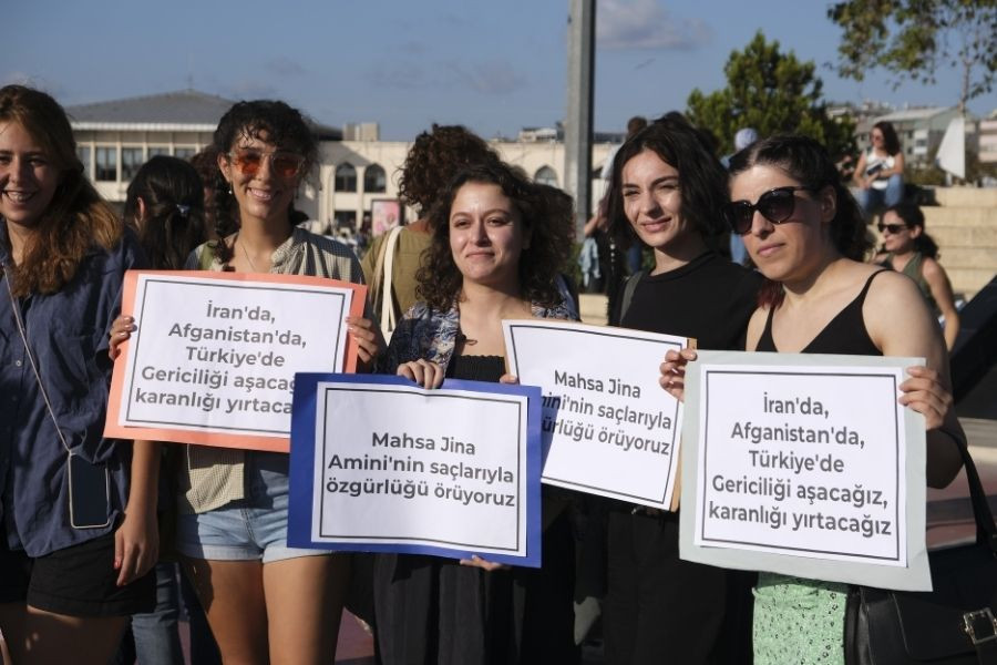 İran’da Mahsa Jina Amini’nin “başörtüsünü düzgün takmadığı” gerekçesiyle ahlak polisi tarafından öldürülmesinin yıldönümünde İstanbul Kadıköy’de kadınlar “Mahsa Jîna Amini için her yerde özgürlüğü örüyoruz” demek için buluştu. Polis eylem alanına Yabancı basının girmesine izin vermedi. Farsça yazılı dövizler de "Zen Zendagi Azadi" yazılı dövizleri de polis eylem alanına almadı. Eyleme katılmak isteyen İranlıların alana alınmaması üzerine eylem komitesi basın açıklaması yapmayacağını açıklayarak eylem alanının dışına yürümek istedi. Türkiyeli kadınların attığı sloganlara barikatların ötesinde olan İranlı kadınlar, "Zen, zendegi, azadi" sloganıyla yanıt verdi. Kadınların ısrarı sonucu İranlı kadınlar da eylem alanına katıldı.