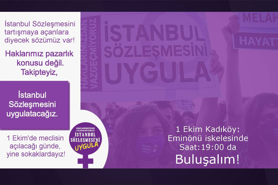 1 Ekim Perşembe Günü Kadıköy- Eminönü İskelesi önünde buluşuyoruz; çünkü İstanbul Sözleşmesini tartışmaya açanlara diyecek sözümüz var: Haklarımız pazarlık konusu değil. Takipteyiz, İstanbul Sözleşmesi'ni uygulatacağız.