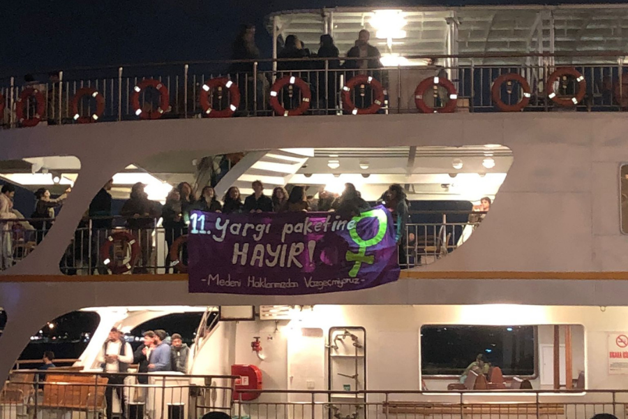 Beşiktaş vapurunda Medeni Haklarımızdan Vazgeçmiyoruz Kampanya Grubu, "11. yargı paketine hayır" diyerek pankart açtı; "Susmuyoruz, korkmuyoruz, itaat etmiyoruz", "Devlet elini bedenimden çek" sloganlarını attı.