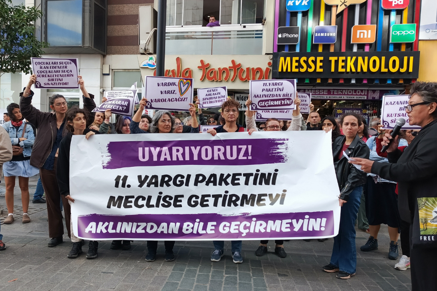 "Geçtiğimiz günlerde kamuoyuna yansıyan 11. Yargı Paketi, 'genel ahlaka aykırılık', 'doğuştan gelen biyolojik cinsiyete uygun davranmama', 'ulaşım araçlarının hareketinin engellenmesi' gibi ifadelerle, 15–18 yaş arasındaki çocukların işledikleri suçlarda yetişkin gibi cezalandırılmasını da kapsayan, son derece geniş bir suç ve suçlu tanımı getiriyor. İktidar, yeni yargı paketiyle kadınların, LGBTİ+’ların her gün daralan yaşamını daha da zorlaştırmak istiyor. Bizler 11. Yargı Paketi’ne hayır demek için bugün birçok ilde bir araya geldik. İstanbul'da da Kadıköy'de buluştuk. Kaymakamlık tarafından son dakika eylemimize yönelik yasak kararı çıkartıldı. Henüz eyleme başlamadan ablukaya alındık. 2 arkadaşımız gerekçe gösterilmeden gözaltına alındı. Bugün buradan herkese sesleniyoruz: Mücadelelerimizle kazandığımız hiçbir hakkın elimizden alınmasına izin vermeyeceğiz. 11. Yargı Paketi’nin karşısında birlikte durmaya devam edeceğiz."
