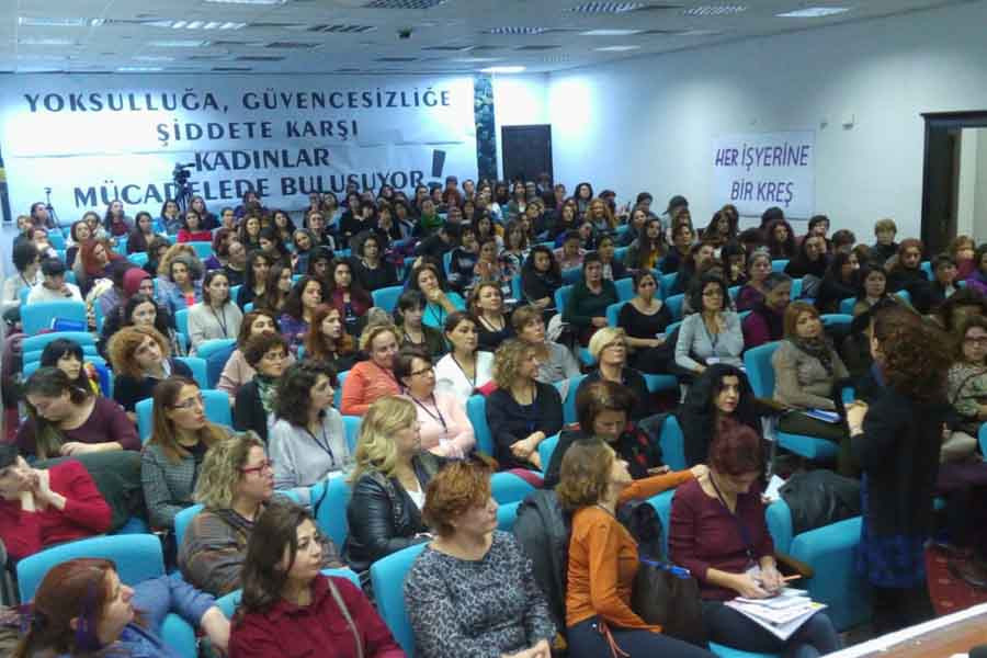 Tüm Bel-Sen Merkez Kadın Sekreteri Semra Kıratlı, Türkiye’de kadın istihdamının dünyanın çok altında olduğuna dikkat çekti. Belediyelerin yerel demokrasinin geliştiği, halkın daha fazla hizmet aldığı, kadın ve çocuklar üzerinden hayatın kolaylaştırılmaya çalışılan kurumlar olduğunu kaydeden Kıratlı, belediyeleri yöneten hangi parti olursa olsun işyerlerinde cinsiyetçi işbölümünün ve mobingin çok yaygın olduğunu ifade etti. Son iki yılda belediyelere atanan kayyımların ilk yöneldiklerinin kadın çalışmaları ve kadın çalışanlar olduğuna dikkat çeken Kıratlı, “Bu belediyelerdeki kadın merkezlerinin tamamı kapandı, kadının toplumsal yaşamda güçlendirilmesini açılan merkezler, kooperatifler, şiddetle mücadele merkezleri, kreşler kapatıldı. Oysaki kadınlar için kreşlerin ciddi bir yeri var ama Kur’an kurslarına dönüştürüldü. Pek çok kadın işten çıkarıldı. Bunlar önemli gündemlerimiz” dedi.KADINLAR İŞ VE EV YÜKÜNDEN SENDİKADA YETERİ KADAR YER ALAMIYOR