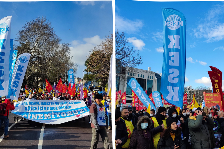 Saat 12.00’de Savarona Caddesi’nde toplanıp "Geçinemiyoruz" diyen kamu emekçileri, saat 13.00’te Kartal Meydanı’na doğru yürümeye başladı. Yürüyüşye “Savaşa değil emekçiye bütçe”, “İnsanca yaşamak istiyoruz”, “İş, ekmek, özgürlük”, “Birleşe birleşe kazanacağız”, “İnsanca yaşamak istiyoruz” sloganları atıldı.