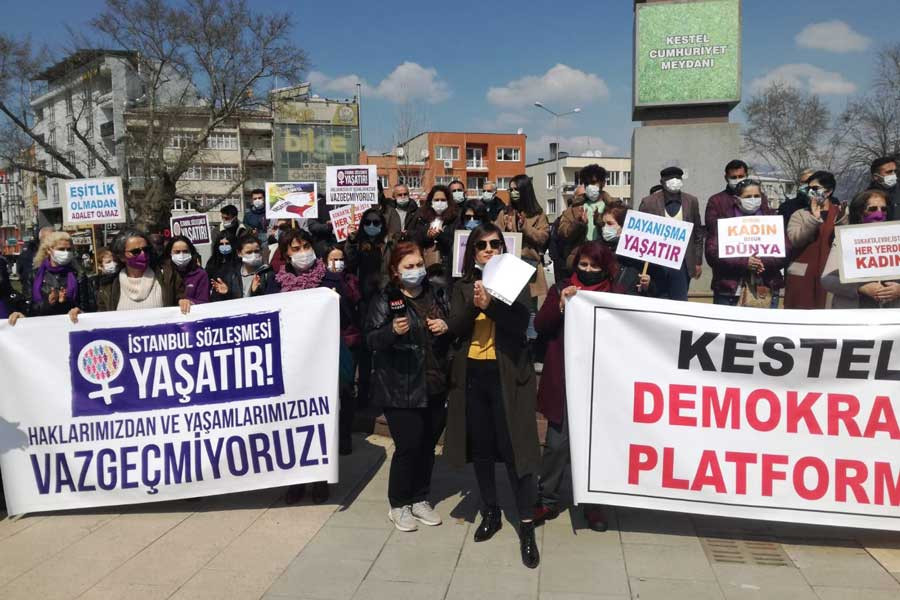 Bursa Kestel’de Kestel Demokrasi Platformu İstanbul Sözleşmesi’nden çekilme kararına karşı basın açıklaması yaptı. Kestel Meydanı’nda yapılan açıklamada “İstanbul Sözleşmesi bizimdir vazgeçmiyoruz”, “Kadın cinayetleri politiktir” sloganları atıldı. Demokrasi Platformu adına açıklamayı Fadime Erezer okudu. Erezer, “İstanbul Sözleşmesi’ni kendine tehdit olarak gören siyasi iktidarın baskıcı ve ataerkil isteklerine teslim olmayacağız. Biliyoruz ki kadın cinayetleri politiktir. Yaşamın her alanında kadın mücadelesi ve dayanışmasını hep beraber inşa edeceğiz. Yaşam hakkı için, özgürlük için vazgeçmiyoruz, kabul etmiyoruz! Hepimiz bulunduğumuz her alanda, kadın düşmanlığının ve nefretin adını koyup teşhir etmeye, hayır demeye, kadınlar üstündeki baskılar son bulana kadar mücadele etmeye devam edeceğiz. Kadını evde, işyerinde, yaşamın her alanında köle olarak gören zihniyetin yaşam hakkımızın elimizden almasına izin vermeyeceğiz! Kazanımlarımızdan geri adım atmayacağız! İstanbul Sözleşmesi geri gelene kadar susmayacağız! Sokakları, meydanları terketmeyeceğiz!” dedi.