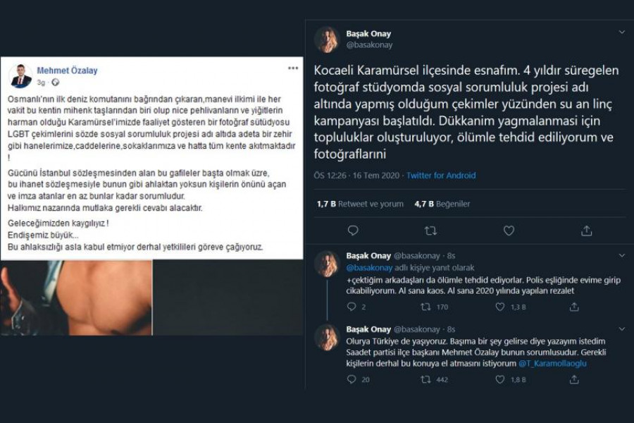 Saadet Partisi Karamürsel İlçe Başkanı Mehmet Özalay'ın yaptığı nefret söylemleri içeren demogojik paylaşımın ardından hem Başak Onay hem de fotoğraflarını çektiği modeller ölümle tehdit edilmişti.