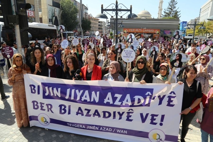 Van Milletvekili Gülcan Kaçmaz Sayyiğit, Kürt kadını öncülüğünde ortaya çıkan “Jin, jiyan, azadî” sloganının evrenselleştiğine değinerek, Amerika Birleşik Devletleri’nin Los Angeles kentinde bir kavşağa “Jin, jiyan, azadî” isminin verildiğini hatırlattı. Sayyiğit, “Ama maalesef biz bu topraklarda sesimizi çıkarmaya çalışırken ablukaya alınıyoruz. Molla rejiminin nasıl ki Jîna şahsında kolonları sarsıldıysa, AKP-MHP faşist iktidarı da cinsiyetçi politikaları da Kürt ve Türkiyeli kadınların öncülüğünde yıkılacak. Rojava’da nasıl bir kadın devrimi hayata geçirildiyse, oradaki zafer bir başarı sembolüne dönüştüyse, Jîna şahsında da bir özgürlük sembolü ortaya çıkmıştır. Leyla Qasımlardan, Sakinelerden, Sevêlere kadar bu mücadele nasıl bu günlere geldiyse bundan sonra da devam edecektir” dedi.