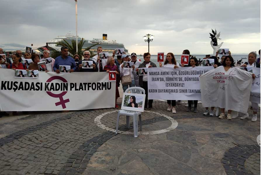 İran’da ahlak polisi tarafından katledilen Mahsa Amini için Kuşadası Kadın Platformu Kuşadası’nda yaşayan İranlıların da katılımıyla basın açıklaması yaptı. İsmail Cem Barış ve Dostluk Meydanı’nda toplanan kadınlar Mahsa Amini’nin fotoğraflarını taşıdı. Kadınlar adına şu açıklama yapıldı: