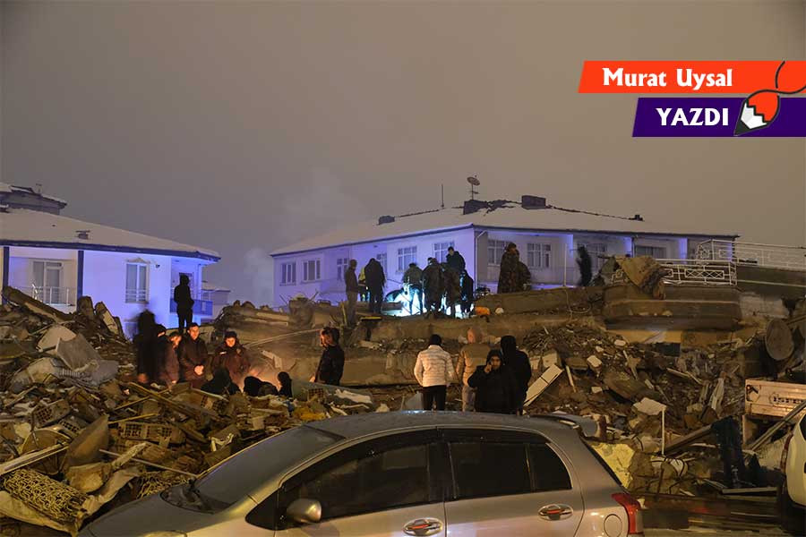 Otobüsle gelirken gördüğüm enkaza doğru ilerliyorum. Yolun sol şeridi sıra sıra çökmüş, üst üste binmiş katlar. Malatya’nın en merkezi yerinde, iki alışveriş merkezinin dibinde, belediye binasına 10 dakikalık mesafedeki enkazlarda AFAD ekipleri görünmüyor. 5-6 enkazın birinde ancak AFAD ekiplerine rastlıyorum. Arama kurtarma çalışmalarının sürdüğü bir enkaza doğru yaklaşıyorum. Gece 02.00’ye geliyor. Enkaz başında Kürt bir aile var. Çoğu çocuk 4 ailenin içeride olduğunu öğreniyorum. Ben oradayken bir kız çocuğu kurtarılıyor. Hemen ambulansa bindirilip hastaneye yetiştiriliyor. İçeride daha 20’nin üzerinde insan olduğu tahmin ediliyor. Yardıma gelen içeridekilerin akrabası Veli ile konuşuyorum. Veli daha tepede yeni binalarda oturuyor.