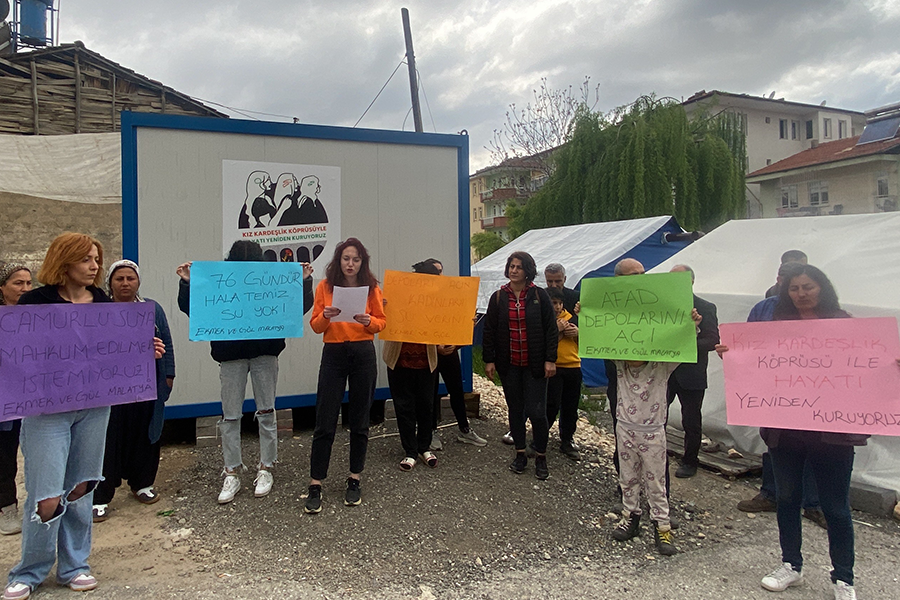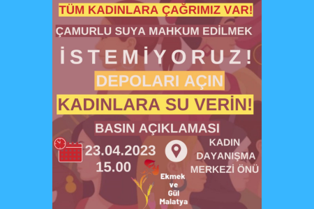 Açıklamayı Ekmek ve Gül Grubundan Diren Aksu okudu. Depremin üzerinden 76 gün geçmesine rağmen hâlâ suların düzeltilmediğine değinen Aksu, temiz suyun gönüllüler aracılığıyla temin edildiğine dikkat çekti. Suların kirli olmasından kaynaklı hastalıkların arttığına değinen Aksu, şunları söyledi: "Depremin üzerinden 76 gün geçmesine rağmen hâlâ hiçbir sorun çözülmedi. Barınma, gıda, ısınma ve su gibi en temel ihtiyaçlarımıza bile erişemez olduk. Depremin ilk gününde suların kullanılmaması için duyuru yapan MASKİ ve Malatya Büyükşehir Belediyesi, depremin üzerinden 76 gün geçmesine rağmen hâlâ suları kullanılabilir hale getirmedi. Depremin ilk günlerinde kirli suları kaynatarak çocuklarına içiren kadınlar, kendileri ve çocukları birçok hastalıkla karşı karşıya kaldılar.”